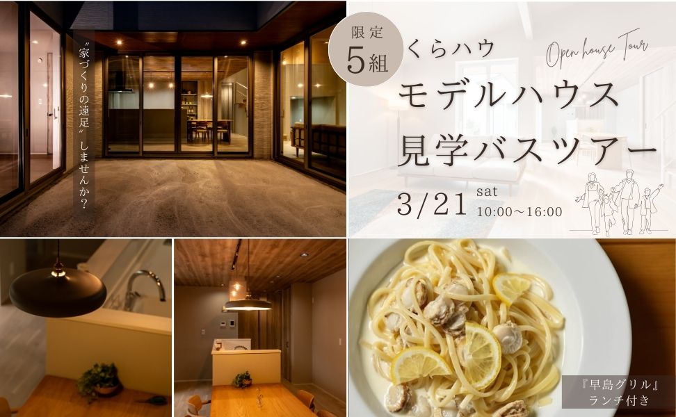 3つのモデルハウス見学とランチ、 さらにお金や土地の不安もまとめて相談できるバスツアーです🍀 🚌モデルハウス見学バスツアー タイプの違う住まいを一度に見学できます! 🍕選べるランチ付き お昼は『早島グリル』でゆっくり休憩♪ 💰お金のプロに相談 住宅ローン・予算などお金の不安を分かりやすく解決します! 🏠土地のプロに相談 土地の疑問を気軽に質問できます! 👌聞くだけ・相談だけでもOK 無理な営業は一切いたしません!