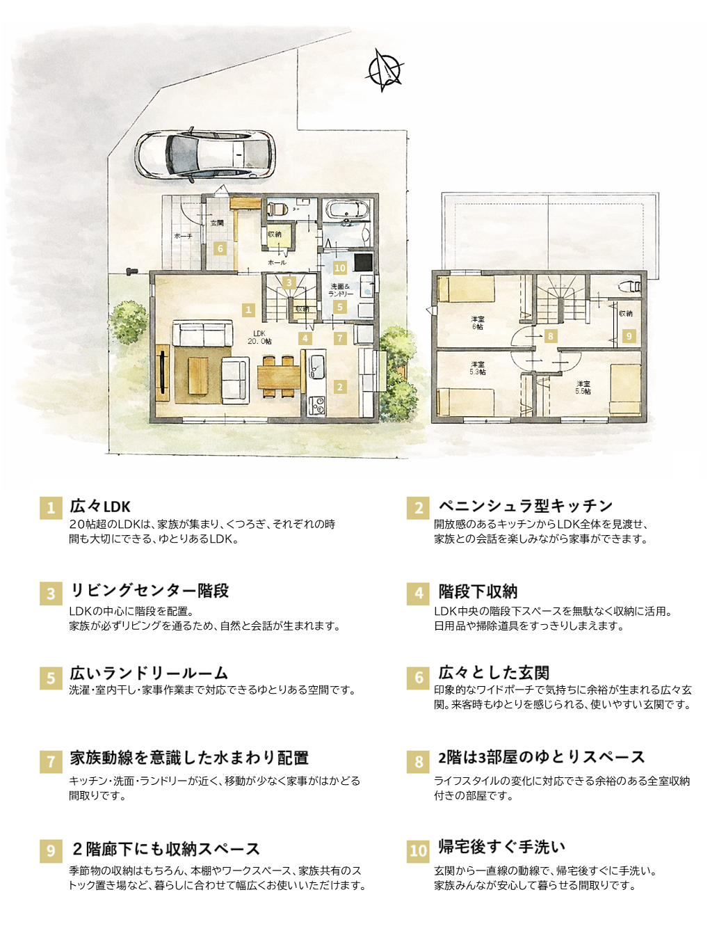 駐車スペースや庭づくりなど、多彩なライフスタイルに対応できる柔軟性を持たせています。